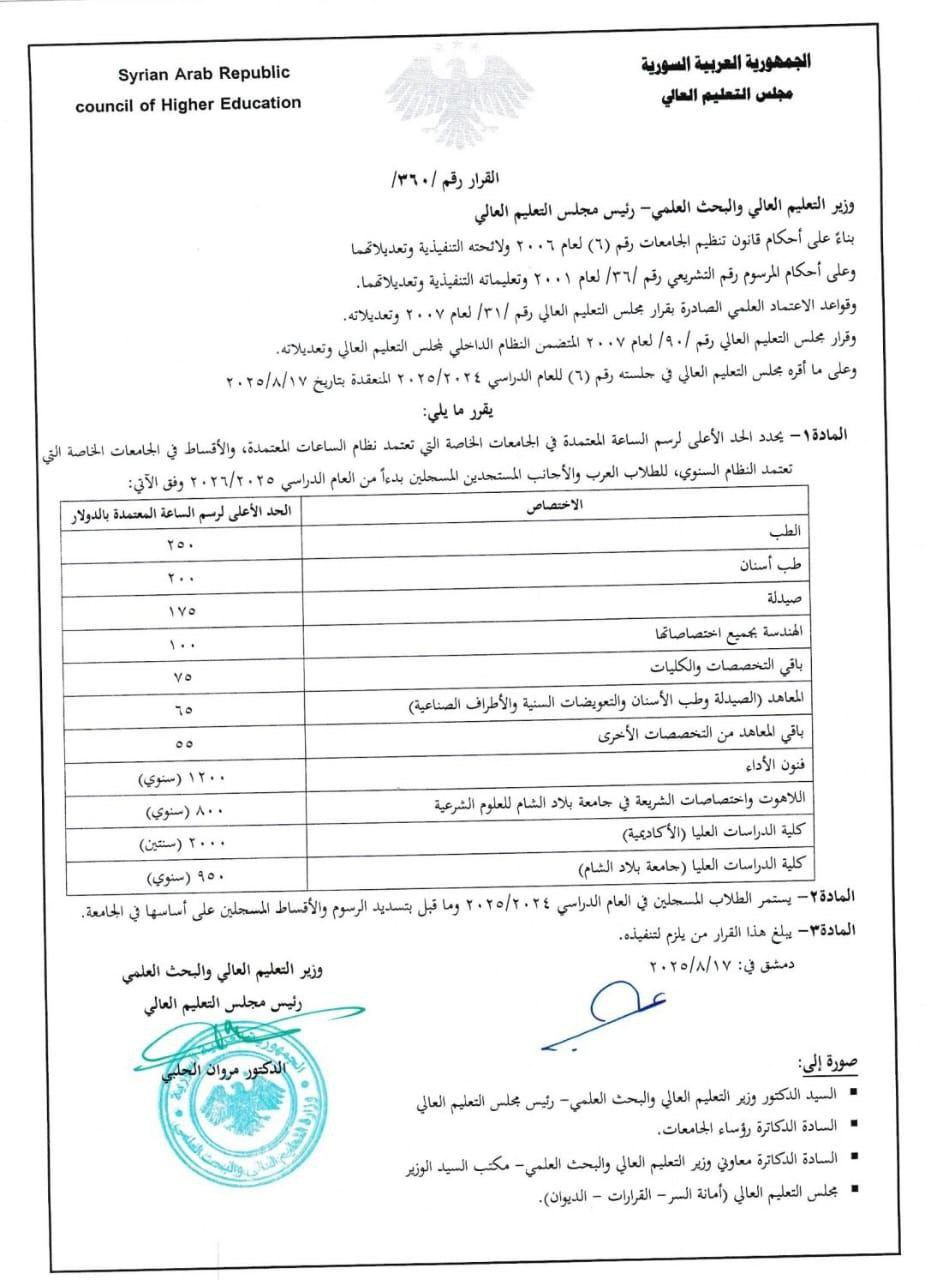 قرار مجلس التعليم العالي رقم/360/ تاريخ 17/8/2025 القاضي بتحديد الحد الأعلى لرسم الساعة المعتمدة في الجامعات الخاصة للطلاب العرب و الأجانب المستجدين المسجلين من العام الدراسي 2025-2026