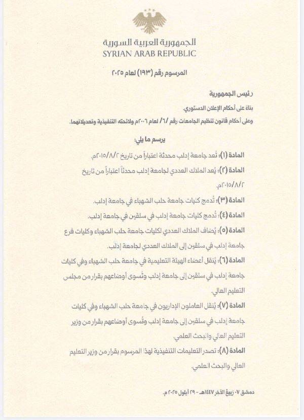 المرسوم رقم /193/ لعام 2025، القاضي باعتبار جامعة إدلب محدثة من تاريخ 2 / 8 / 2015 م.