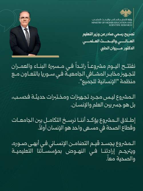 تصريح وزير التعليم العالي والبحث العلمي الدكتور مروان الحلبي حول المشروع الرائد في مسيرة البناء والعمران لتجهيز مخابر المشافي الجامعية في سوريا بالتعاون مع منظمة الإنسانية للجميع