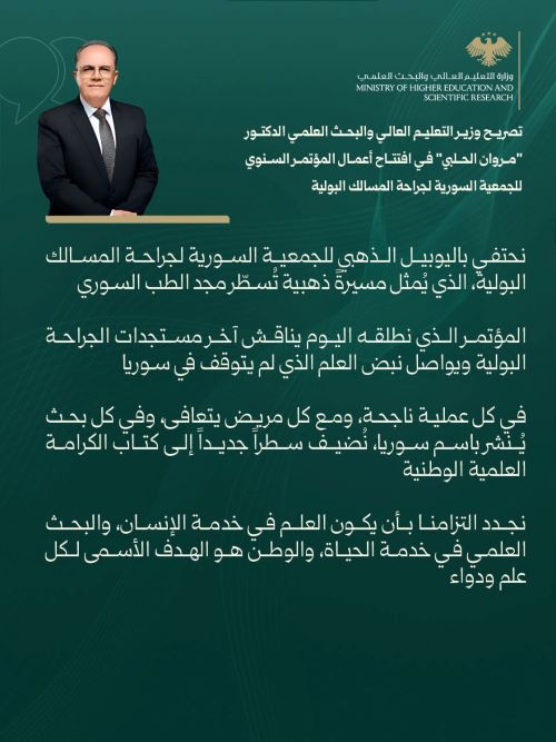 تصريح وزير التعليم العالي والبحث العلمي الدكتور مروان الحلبي في افتتاح أعمال المؤتمر السنوي للجمعية السورية لجراحة المسالك البولية.