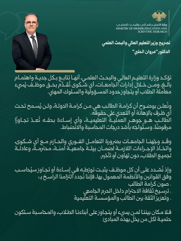 تصريح رسمي صادر عن وزير التعليم العالي والبحث العلمي الدكتور "مروان الحلبي" حول المتابعة بكل اهتمام لأي شكوى تقدم بحق موظف يسيئ معاملة الطلاب أو يتجاوز حدود المسؤولية والسلوك المهني