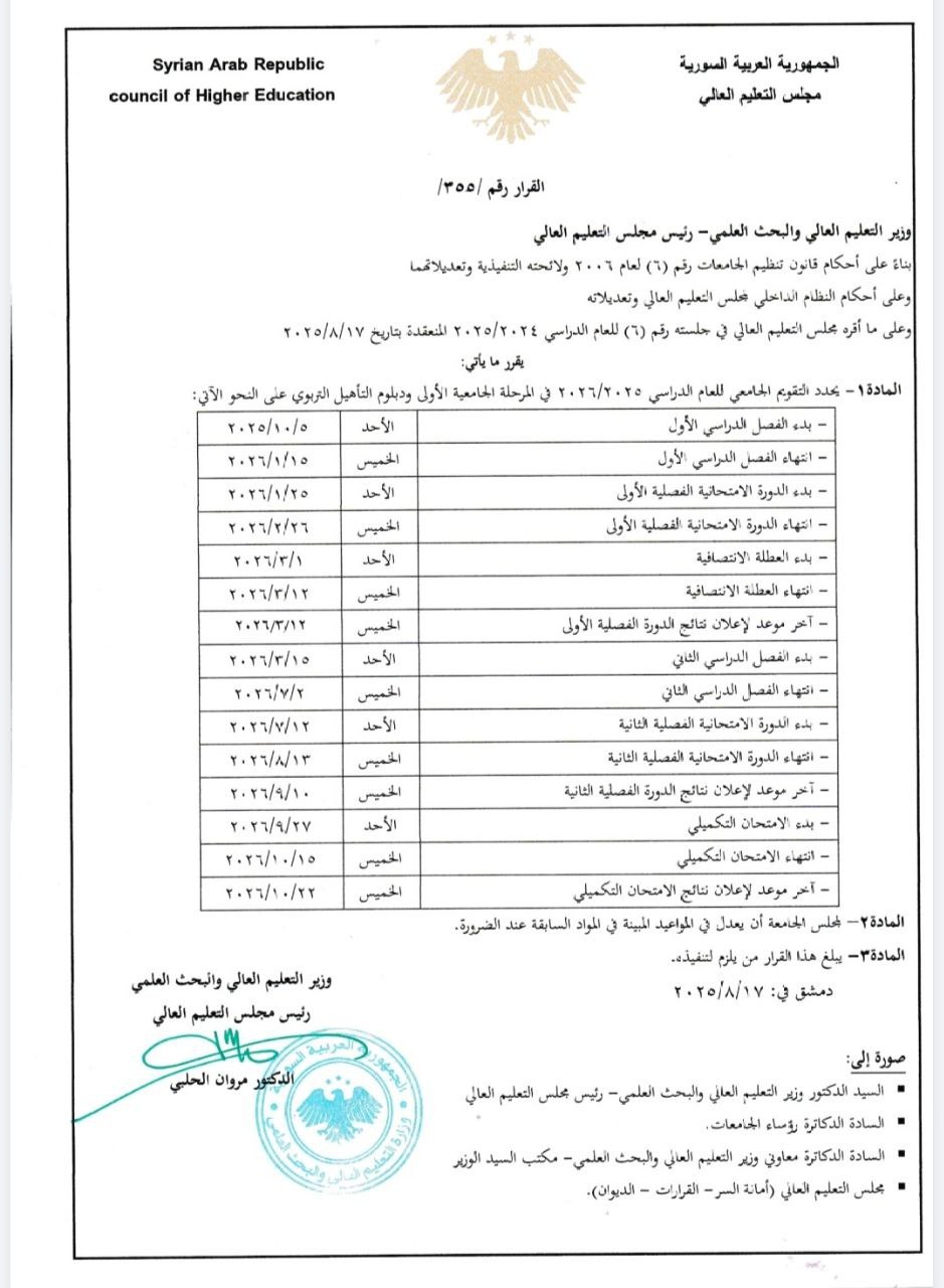 تعميم بتحديد مواعيد امتحانات الدورة التكميلية للعام الدراسي 2024-2025 لطلاب السنة الأخيرة في الجامعات الحكومية السورية خلال الفترة من 12/10/2025 لغاية 23/10/2025
