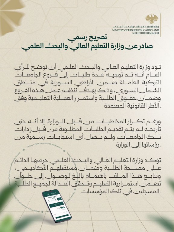 تصريح رسمي صادر عن وزير التعليم العالي والبحث العلمي الدكتور مروان الحلبي بما يخص ملتقى الجامعات السورية في المملكة العربية السعودية.