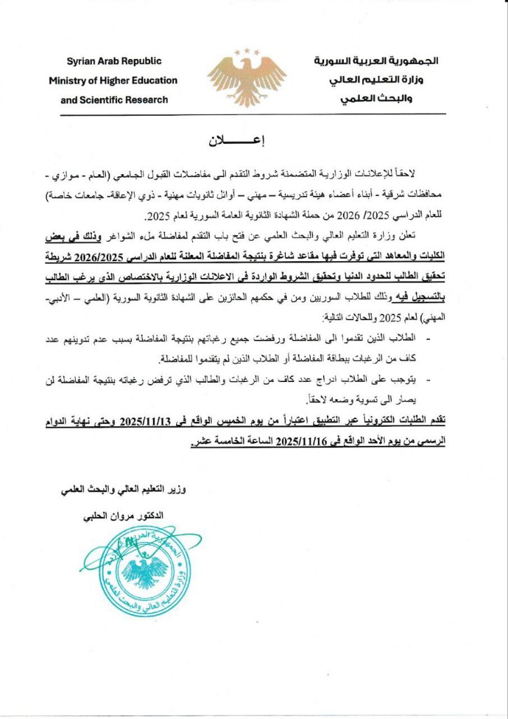 تُعلن وزارة التعليم العالي والبحث العلمي عن مفاضلة ملء الشواغر لحملة الشهادات الثانوية السورية وغير السورية الممنوحة من العام 2011 ولغاية العام 2024 للعام الدراسي 2025-2026