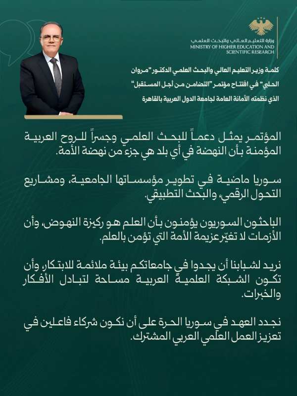 تصريح رسمي صادر عن وزير التعليم العالي والبحث العلمي الدكتور مروان الحلبي بما يخص ملتقى الجامعات السورية في المملكة العربية السعودية.