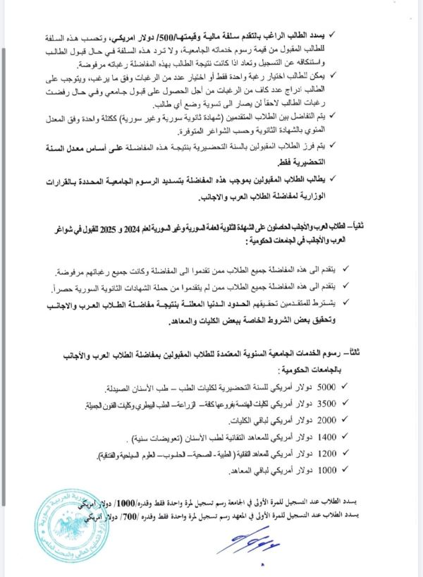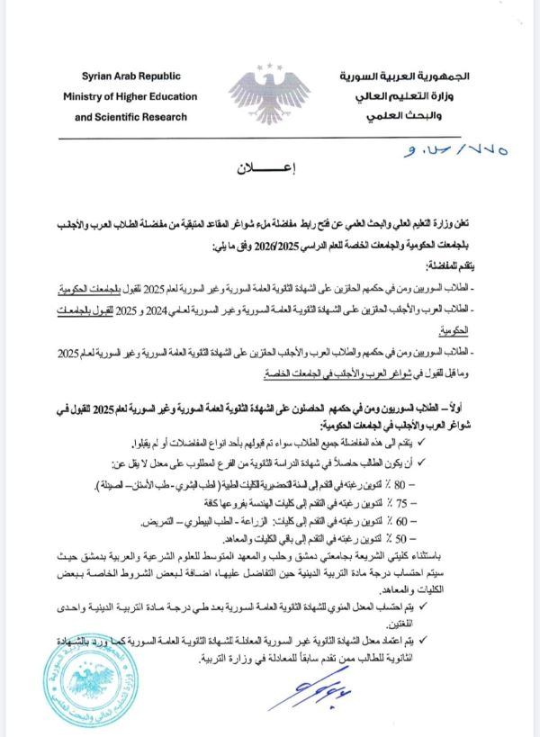 إعلان فتح رابط مفاضلة ملء شواغر المقاعد المتبقية من مفاضلة العرب والأجانب في الجامعات الحكومية والخاصة للعام الدراسي 2025-2026 اعتباراً من 28/11/2025 لغاية يوم الاثنين 1/12/2025 الساعة الالخامسة عشر