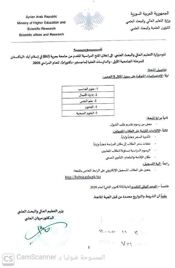 تنوه وزارة التعليم العالي والبحث العلمي إلى إعلان المنح الدراسية المقدم من جامعة بحرية(BU) في إسلام اباد -الباكستان للمرحلة الجامعية الأولى والدراسات العليا(ماجستير -دكتوراه) للعام الدراسي 2026