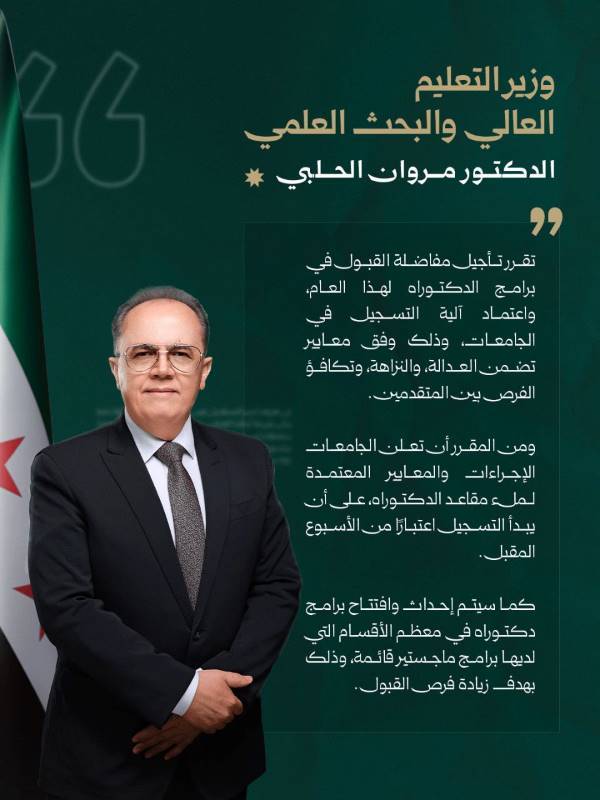 يمدد تسجيل الطلاب المقبولين بنتيجة مفاضلة التحويل المماثل من الجامعات غير السورية (الحكومية- الخاصة) إلى الاختصاصات المماثلة في الجامعات الخاصة السورية ومفاضلة القبول الجامعي ومفاضلات ملء الشواغر للعام الدراسي 2025-2026 لغاية يوم الثلاثاء الواقع في 20/1/2