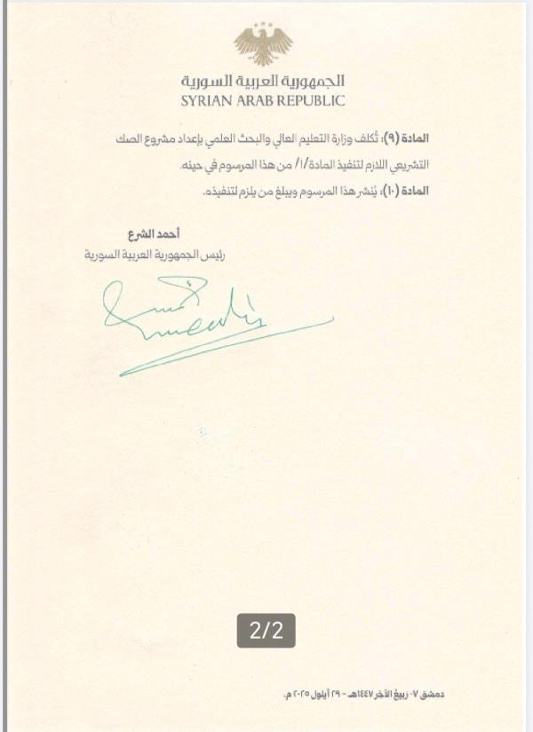 المرسوم رقم /193/ لعام 2025، القاضي باعتبار جامعة إدلب محدثة من تاريخ 2 / 8 / 2015 م.