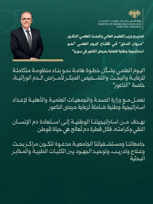 تصريح وزير التعليم العالي والبحث العلمي الدكتور مروان الحلبي في افتتاح اليوم العلمي نحو استراتيجية وطنية للعناية بمرضى الناعور في سوريا.