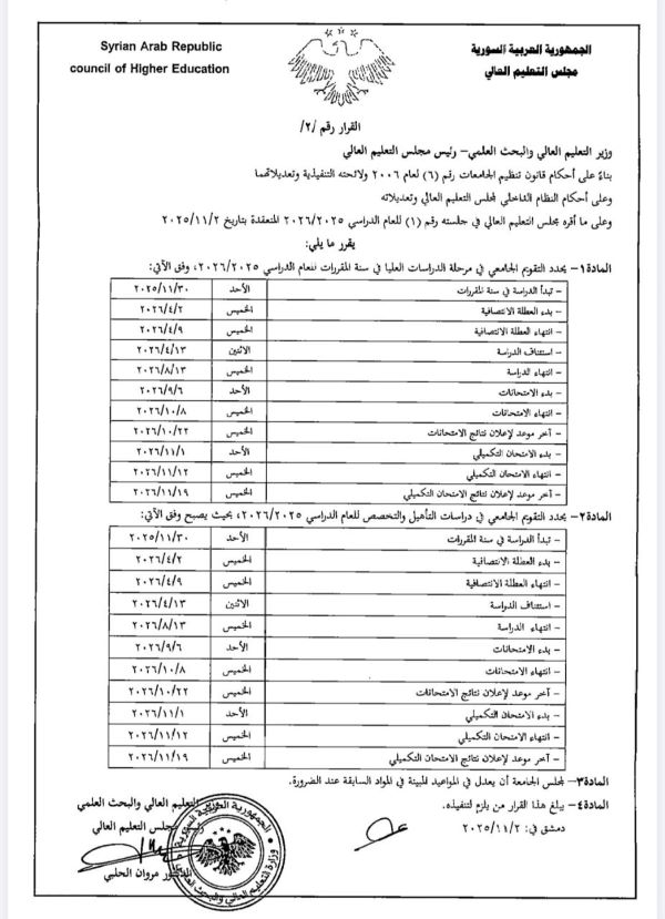 تصريح وزير التعليم العالي والبحث العلمي بمناسبة صدور مرسوم السيد رئيس الجمهورية العربية السورية أحمد الشرع الذي يقضي بمنح طلابنا ترفعاً إدارياً