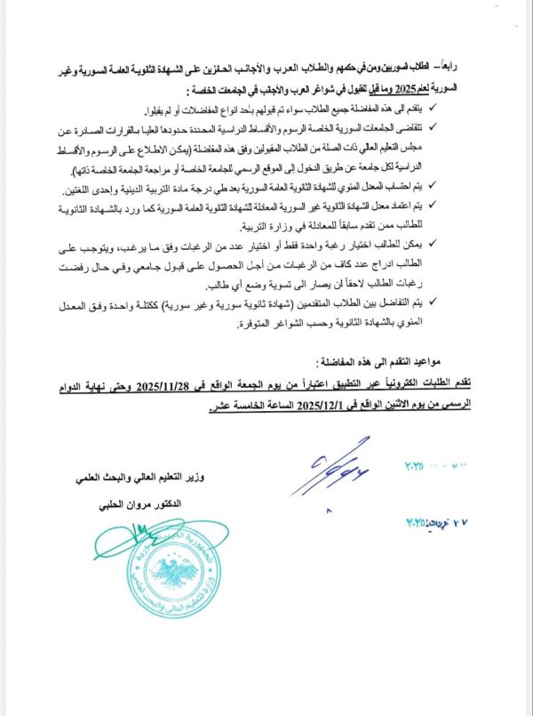 إعلان فتح رابط مفاضلة ملء شواغر المقاعد المتبقية من مفاضلة العرب والأجانب في الجامعات الحكومية والخاصة للعام الدراسي 2025-2026 اعتباراً من 28/11/2025 لغاية يوم الاثنين 1/12/2025 الساعة الالخامسة عشر